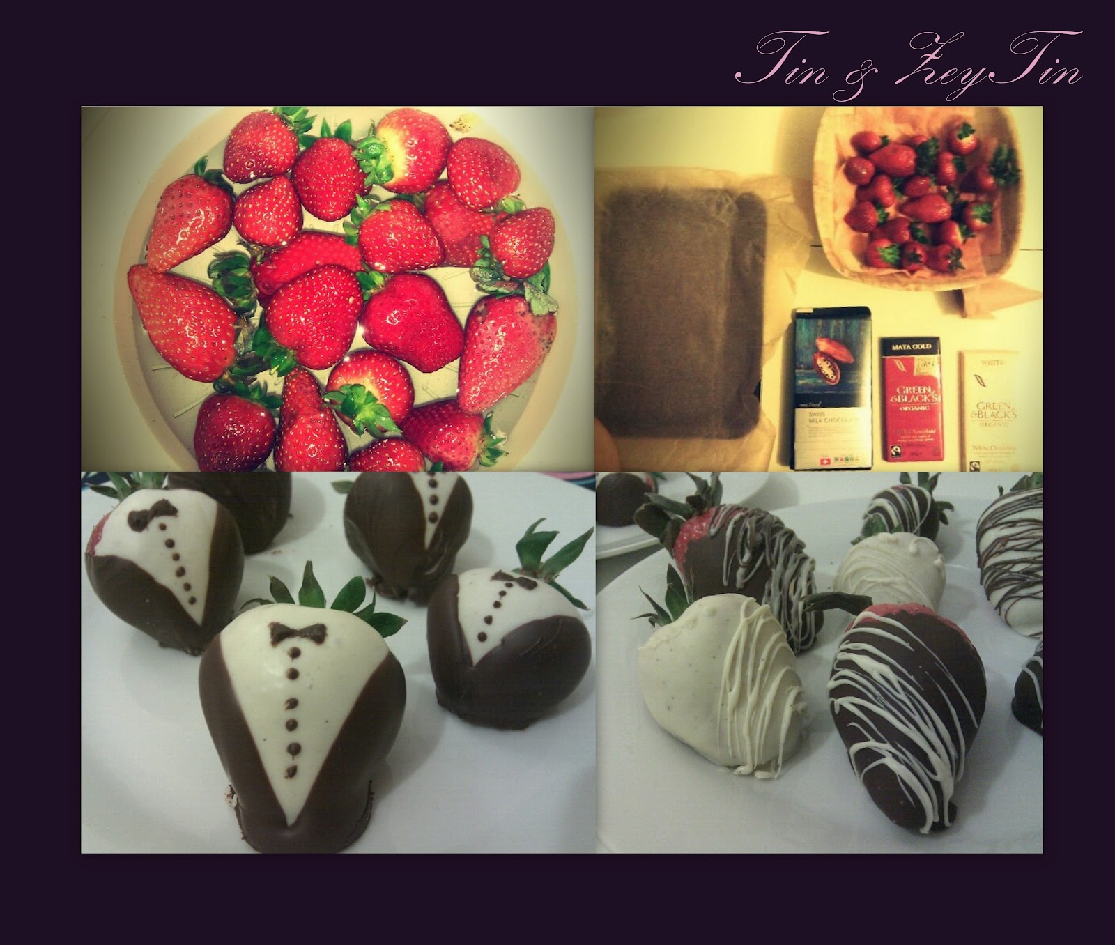 - For tuxedos dip one side of the strawberry to white chocolate then set it in a tray covered with baking sheet.